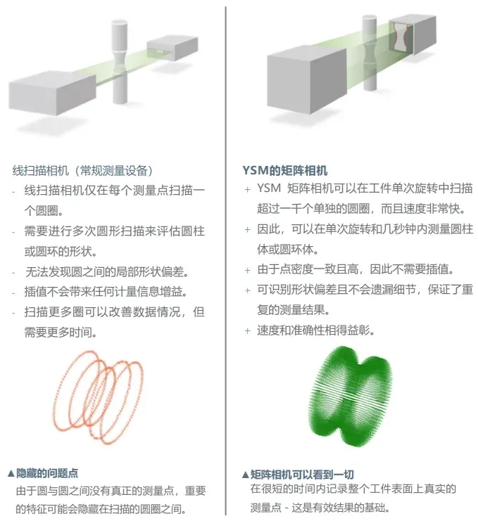 通过联动旋转轴旋转扫描来测量工件几何形状,YSM 的矩阵相机可采集高密度的测量点,这对实现可靠的几何特征评估至关重要。